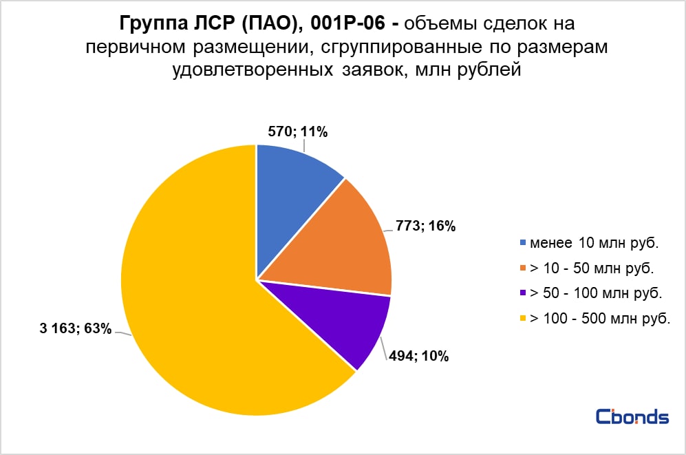 Наибольшую долю в структуре размещения (63%) заняли сделки от 100 до 500 млн рублей, на втором месте идут сделки от 10 до 50 млн рублей (16%).