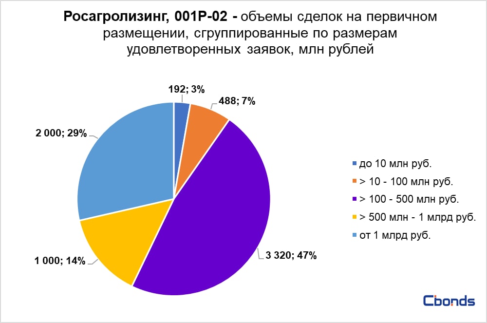 Наибольшую долю в структуре размещения (47%) заняли сделки от 100 до 500 млн рублей, на втором месте идет сделка на 2 млрд рублей (29%).