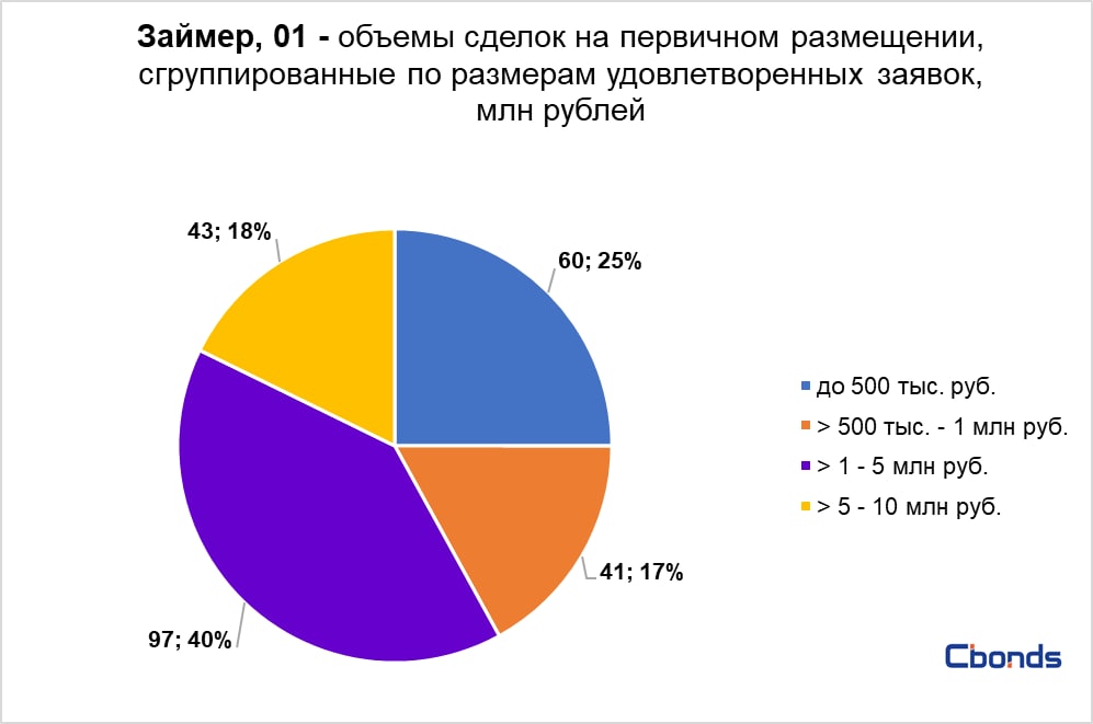 Наибольшую долю в структуре размещения (40%) заняли сделки от 1 до 5 млн рублей, на втором месте идут сделки до 500 тыс рублей (25%).