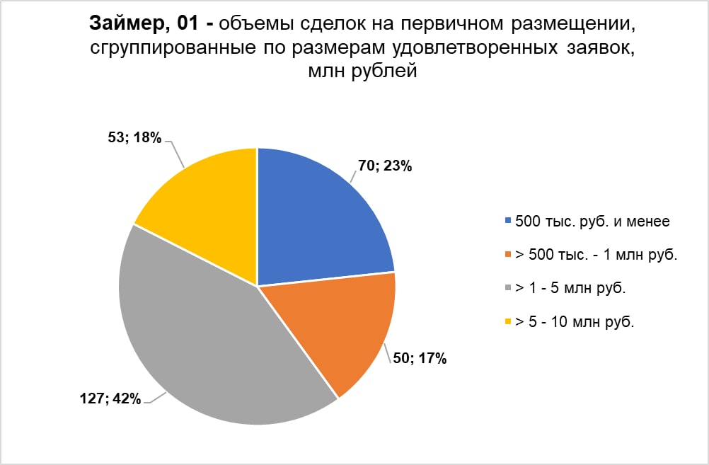 Наибольшую долю в структуре размещения (42%) заняли сделки от 1 млн до 5 млн рублей, на втором месте идут сделки объемом менее 500 тыс рублей (23%).