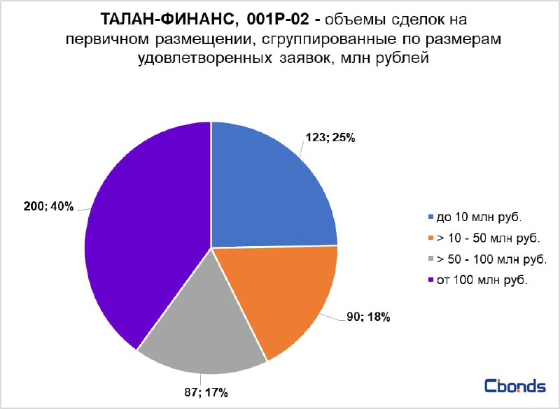 Наибольшую долю в структуре размещения (40%) заняла сделка на 200 млн рублей, на втором месте идут сделки объемом до 10 млн рублей (25%).