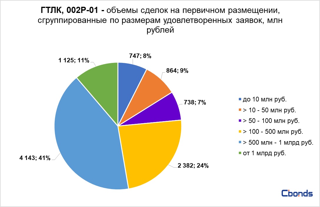 Наибольшую долю в структуре размещения (41%) заняли сделки от 500 млн до 1 млрд рублей, на втором месте идут сделки от 100 до 500 млн рублей (24%).