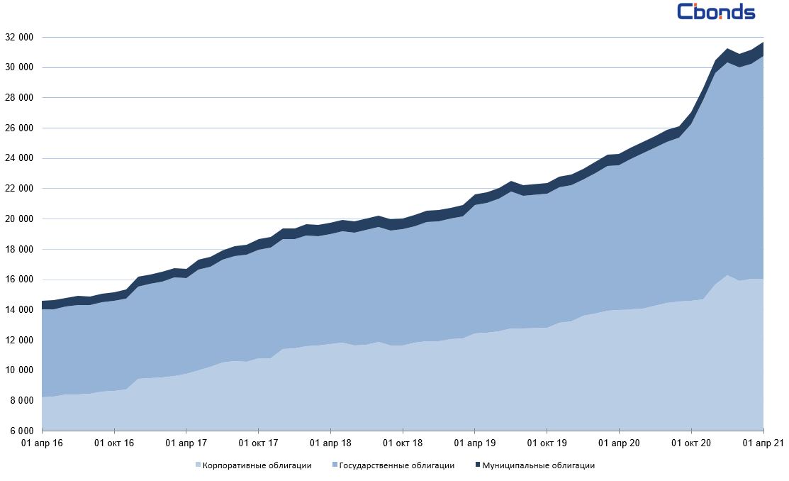 По итогам марта 2021 года объем внутренних корпоративных облигаций России составил 16 036.35 млрд рублей. По сравнению с февралем объем рынка уменьшился на 0.18%. Традиционно на выпуски нефтегазовой отрасли приходится наибольший объем всего рынка — 26.86% (4307.25 млрд рублей) от общего объема российских корпоративных облигаций. На облигации банков — 22.09% (3 542.62 млрд рублей), финансовых институтов — 17.06% (2 736.2 млрд рублей), остальных отраслей экономики — 33.99% (5 450.28 млрд рублей).