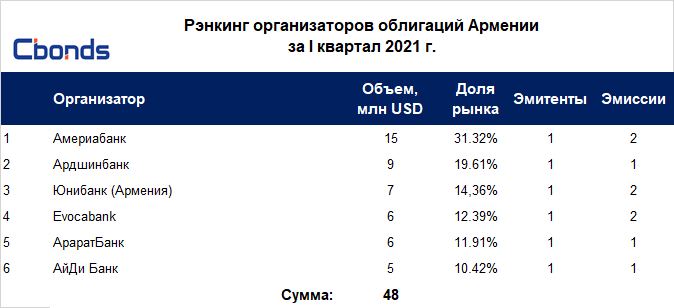 🇦🇲🏆 Рэнкинг организаторов облигаций Армении по итогам I квартала 2021 года