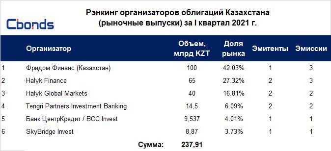 🇰🇿 🏆Рэнкинг организаторов облигаций Казахстана по итогам I квартала 2021 года