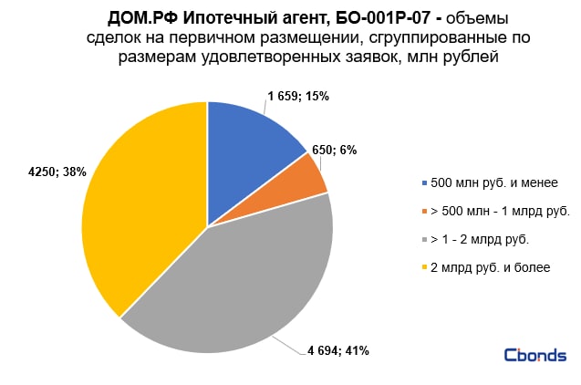 Наибольшую долю в структуре размещения (41%) заняли сделки объемом от 1 до 2 млрд рублей, на втором месте идут сделки объемом более 2 млрд рублей (38%).