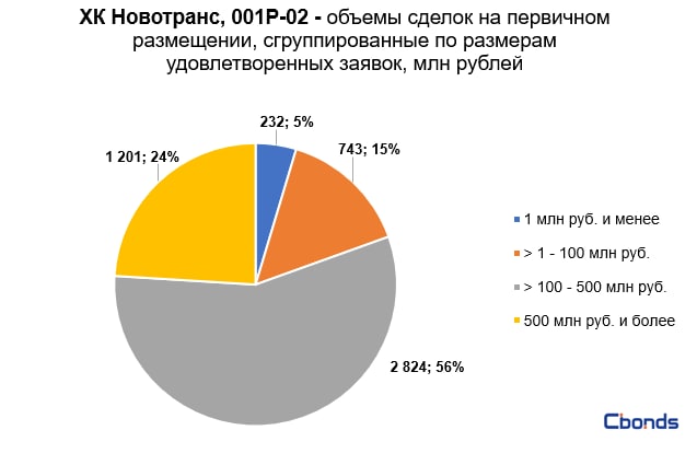 Наибольшую долю в структуре размещения (56%) заняли сделки объемом от 100 до 500 млн рублей, на втором месте идут сделки объемом более 500 млн рублей (24%).