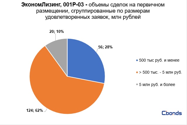 Наибольшую долю в структуре размещения (62%) заняли сделки объемом от 500 тыс до 5 млн рублей, на втором месте идут сделки объемом менее 500 тыс рублей (28%).