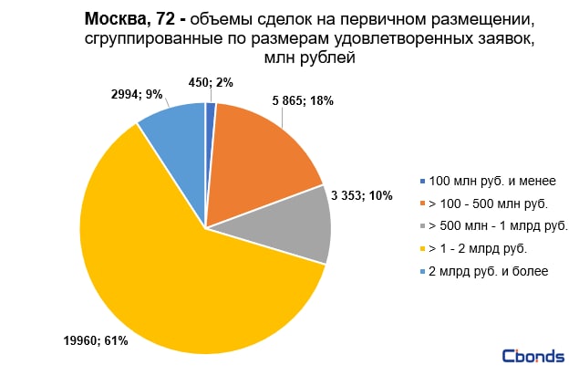 Наибольшую долю в структуре размещения (61%) заняли сделки объемом от 1 до 2 млрд рублей, на втором месте идут сделки объемом от 100 до 500 млн рублей (18%).
