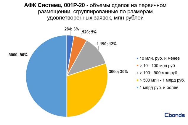Наибольшую долю в структуре размещения (50%) заняли сделки объемом более 1 млрд рублей, на втором месте идут сделки объемом от 500 млн до 1 млрд рублей (30%).