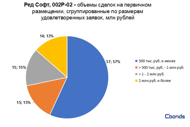 Наибольшую долю в структуре размещения (57%) заняли сделки объемом менее 500 тыс. рублей, на втором месте с равными долями идут сделки объемом от 500 тыс. рублей до 1 млн рублей (15%) и сделки объемом от 1 до 2 млн рублей (15%).