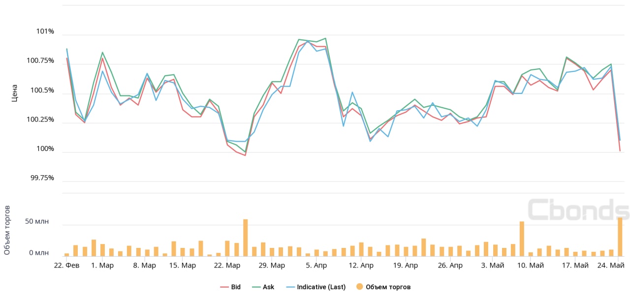 На 15:07 (мск) бумаги серии 03 торгуются по 101.08%, выпуск серии 04 на 15:13 (мск) ‒ по 100.91%. Цены закрытия в пятницу по данным сериям облигаций составили 101.21% и 101.2% соответственно.