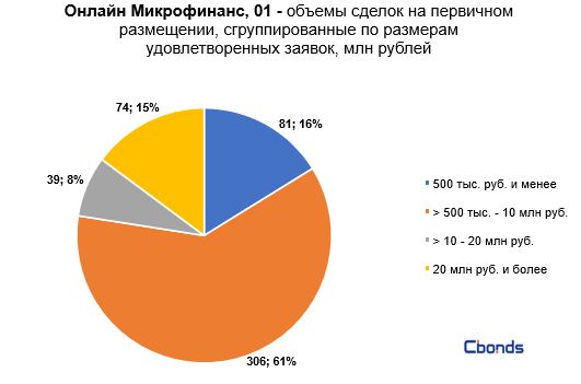 Наибольшую долю в структуре размещения (61%) заняли сделки объемом от 500 тыс. руб. до 10 млн рублей, на втором месте идут сделки объемом 500 тыс. руб. и менее (16%).