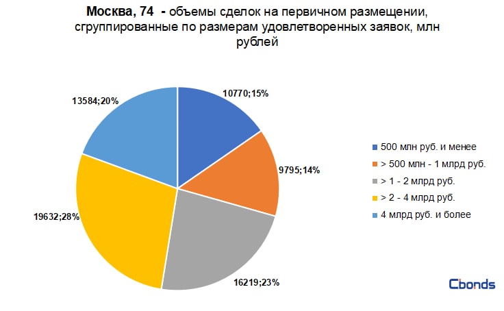 Наибольшую долю в структуре размещения (28%) заняли сделки объемом от 2 до 4 млрд рублей, на втором месте идут сделки объемом от 1 до 2 млрд рублей (23%).