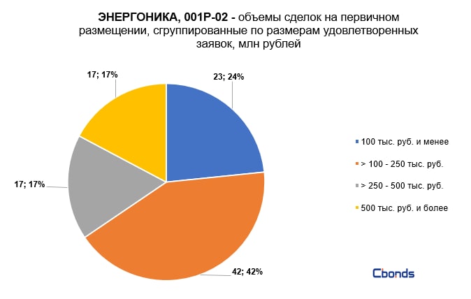 Наибольшую долю в структуре размещения (42%) заняли сделки объемом от 100 до 250 тыс. рублей, на втором месте идут сделки объемом 100 тыс. рублей и менее (24%).