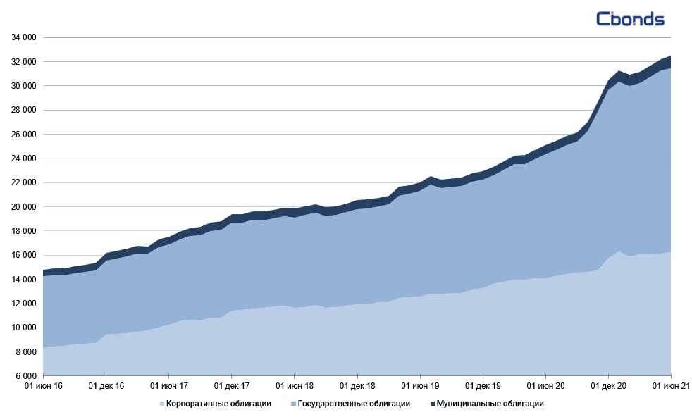 По итогам мая 2021 года объем внутренних корпоративных облигаций России составил 16 212.42 млрд рублей. По сравнению с апрелем объем рынка увеличился на 0.46%.