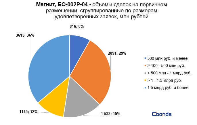 Наибольшую долю в структуре размещения (36%) заняли сделки объемом 1.5 млрд рублей и более, на втором месте идут сделки объемом от 100 до 500 млн рублей (29%).