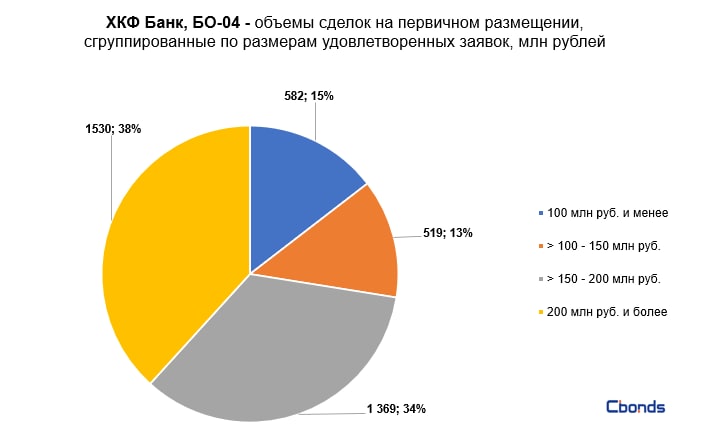 Наибольшую долю в структуре размещения (38%) заняли сделки объемом 200 млн рублей и более, на втором месте идут сделки объемом от 150 до 200 млн рублей (34%).