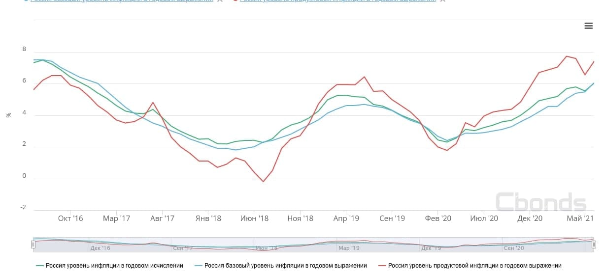 Инфляция выше 6% зарегистрирована в России впервые с октября 2016 года (тогда рост цен в годовом выражении составил 6,1%).