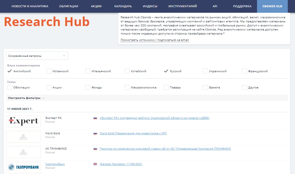 Среди провайдеров аналитики – ведущие российские банки (Газпромбанк, Росбанк, Уралсиб, Россельхозбанк, Альфа-Банк, Промсвязьбанк и др.), брокерские компании (Регион, Фридом Финанс, Велес Капитал, Открытие и др.), управляющие компании (Сбер Управление Активами, Арикапитал и др.), рейтинговые агентства (АКРА, Эксперт РА, НКР, НРА). Также представлена аналитика всех ведущих финансовых институтов стран СНГ и ряда глобальных банков.