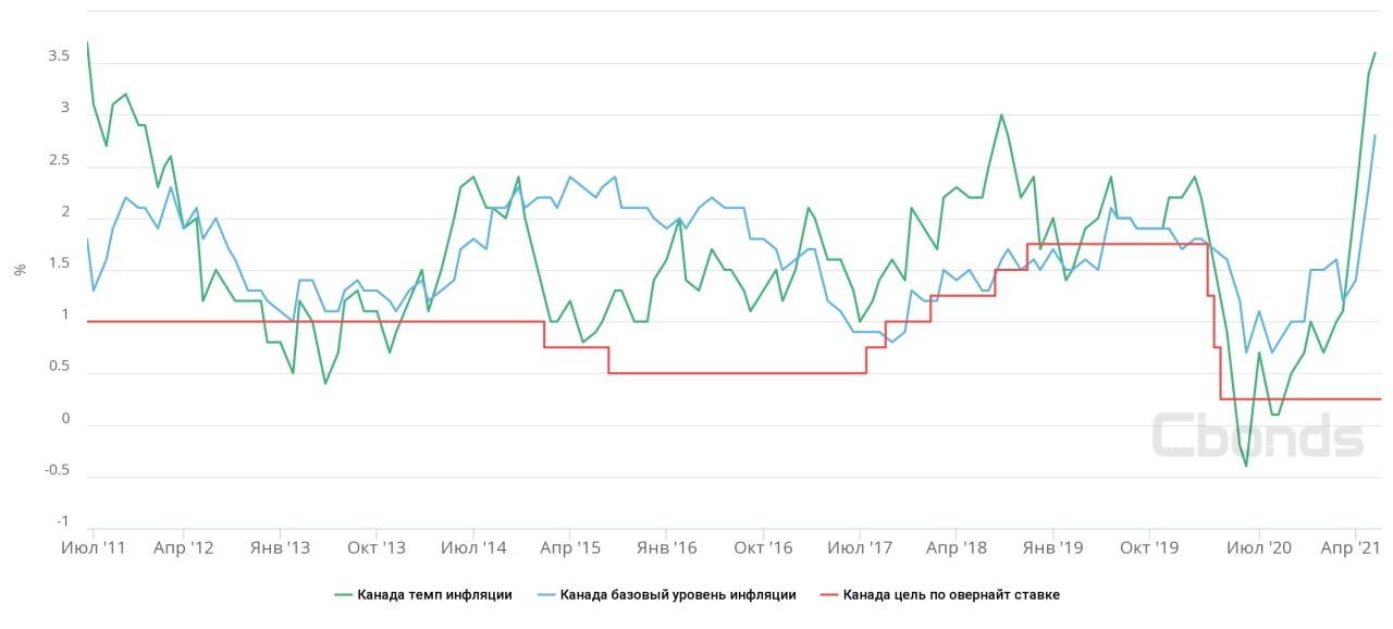 Базовая инфляция составила в мае 2.8% против 2.3% в апреле. Это максимальный рост с марта 2003 года. В апреле Банк Канады уменьшил еженедельной объём покупки активов на баланс с 4 до 3 млрд канадских долларов, на последнем заседании в июне сохранил ставку на уровне 0.25%. Банк прогнозирует временный скачок инфляции летом из-за эффекта низкой базы и роста цены на бензин. Таргет по инфляции в Канаде – 2%, с допустимым диапазоном от 1 до 3% в год.