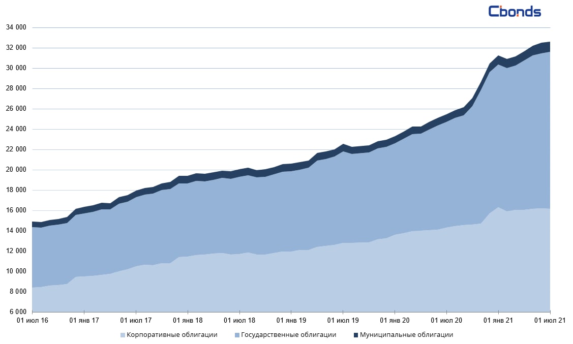 📊Рынок корпоративных облигаций России за июнь сократился на 0.325%, общий объем рынка внутренних облигаций по итогам 1-го полугодия 2021 года составил 32.62 трлн рублей