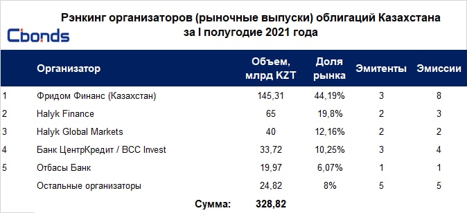 🇰🇿 🏆Рэнкинг организаторов облигаций Казахстана по итогам I полугодия 2021 года