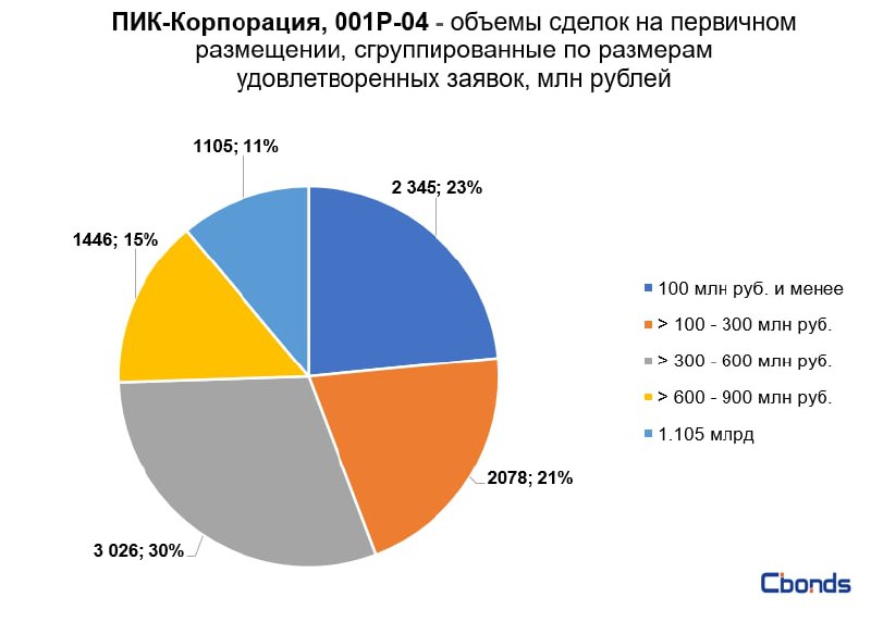 Наибольшую долю в структуре размещения (30%) заняли сделки объемом от 300 до 600 млн рублей, на втором месте идут сделки объемом 100 млн рублей и менее (23%).