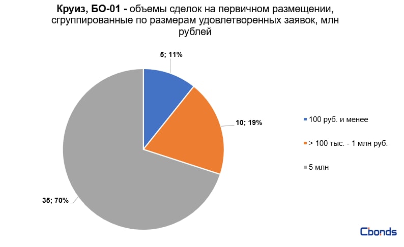 Наибольшую долю в структуре размещения (70%) заняла сделка объемом 5 млн рублей, на втором месте идут сделки объемом от 100 тыс. до 1 млн рублей (19%).