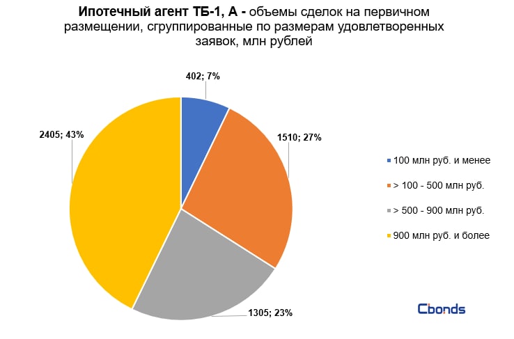 Наибольшую долю в структуре размещения (43%) заняли сделки объемом 900 млн рублей и более, на втором месте идут сделки объемом от 100 до 500 млн рублей (27%).