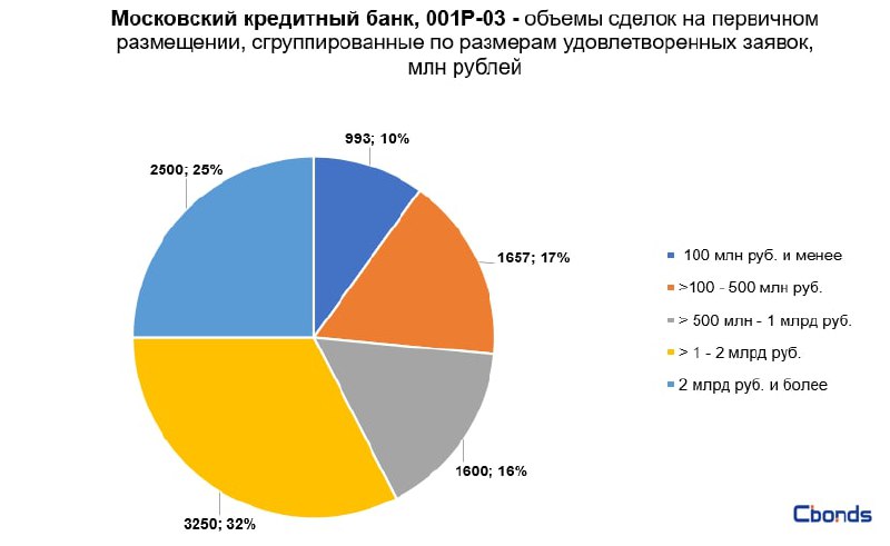 Наибольшую долю в структуре размещения (32%) заняли сделки объемом от 1 до 2 млрд рублей, на втором месте идёт сделка объемом 2.5 млрд рублей (25%).