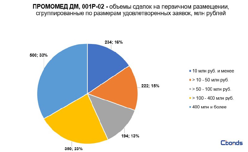 Наибольшую долю в структуре размещения (33%) заняла сделка объемом 500 млн рублей, на втором месте идёт сделка объемом 350 млн рублей (23%).