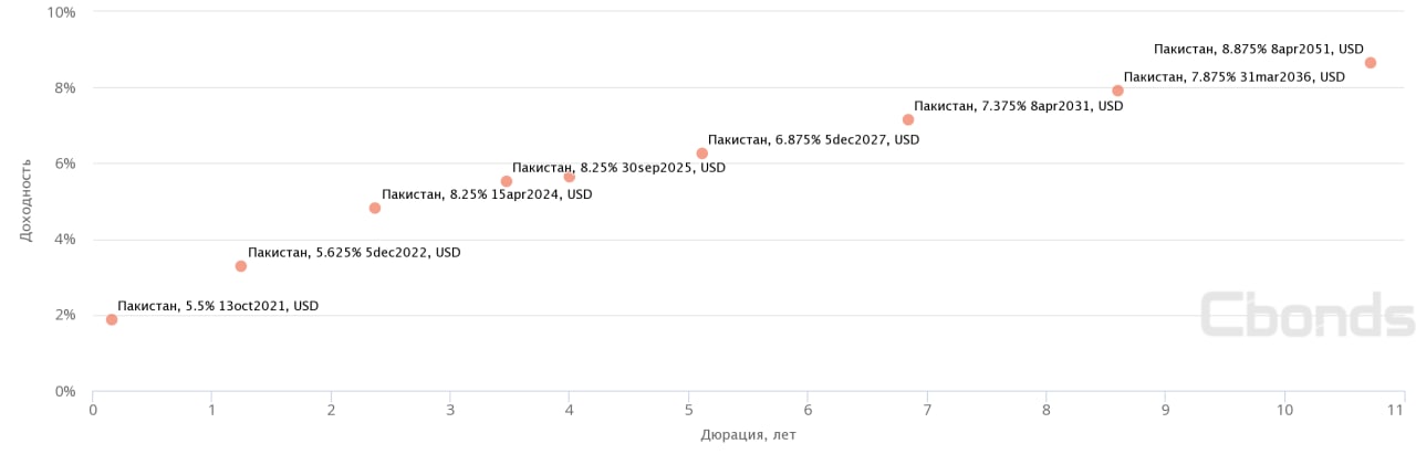 У Пакистана 9 еврооблигаций, все они в долларах, суммарный евробондовый долг $8.9 млрд. Рейтинг страны в ин.валюте очень скромный (B3 / B- / B).