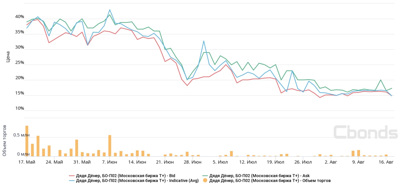 🖇На фоне данных новостей находящийся в обращении выпуск облигаций серии БО-П02 демонстрирует отрицательную динамику: на 11:52 (мск) бумаги торгуются по 14.78% против вчерашних 16.47%. По бумагам серии БО-П01 зафиксирован дефолт по погашению.