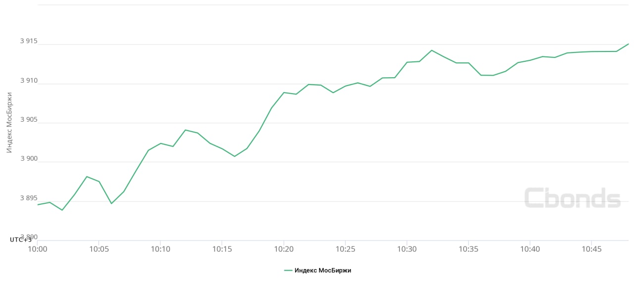 Рублевый индекс Мосбиржи к 10:35 (мск) рос на 0,4% – до 3911,06 пункта (уже поднимался до 3915,09 пункта), долларовый индекс РТС – на 0,22%, до 1677,8 пункта.