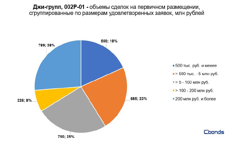 Наибольшую долю в структуре размещения (38%) заняли сделки объемом 200 млн рублей и более, на втором месте идут сделки объемом от 5 до 100 млн рублей (25%).