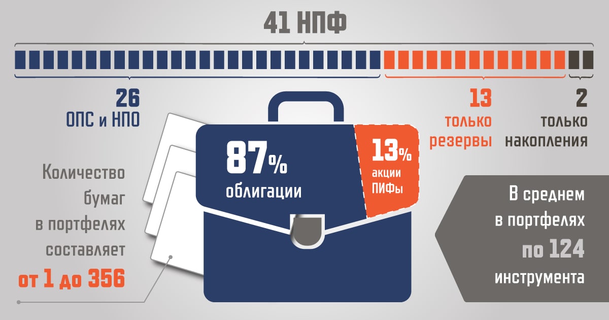 В составе портфелей НПФ большую часть занимают облигации – 87% от рыночной стоимости всех ценных бумаг в портфелях. Остальное приходится на российские акции и паевые инвестиционные фонды. Количество бумаг в портфелях составляет от 1 до 356. В среднем в портфелях по 124 инструмента.