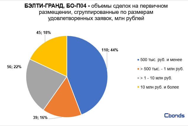 Наибольшую долю в структуре размещения (44%) заняли сделки объемом менее 500 тыс. рублей, на втором месте идут сделки объемом от 1 до 10 млн рублей (22%).