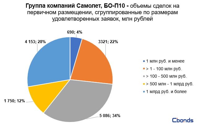 Наибольшую долю в структуре размещения (34%) заняли сделки объемом от 100 до 500 млн рублей, на втором месте идут сделки объемом более 1 млрд рублей (28%).