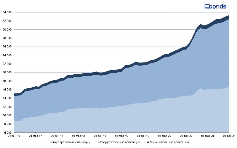 По итогам августа 2021 года объем внутренних корпоративных облигаций России составил 16 584.37 млрд рублей. По сравнению с июлем объем рынка увеличился на 1.07%.