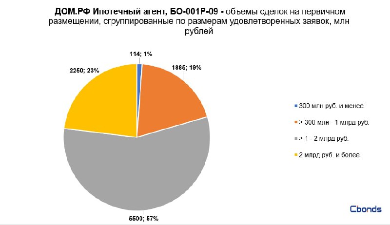 Наибольшую долю в структуре размещения (57%) заняли сделки объемом от 1 до 2 млрд рублей, на втором месте идёт сделка объемом 2.25 млрд рублей (23%).