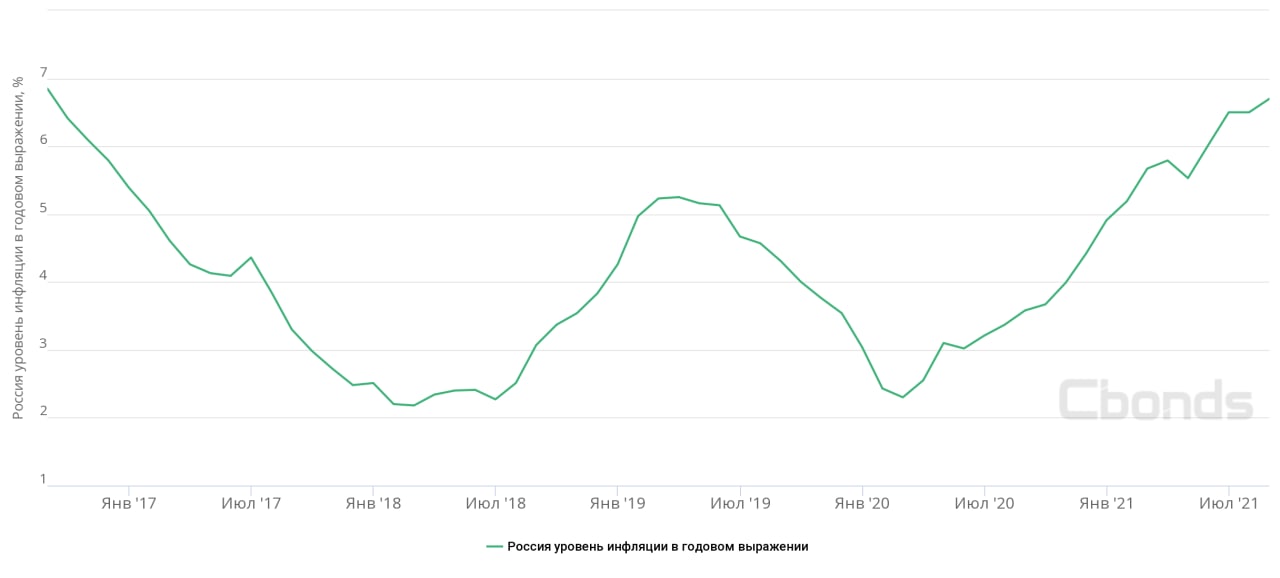 💬На данный момент значение показателя превышает прогнозные значения экспертов на конец 3-го квартала 2021 года. Согласно консенсус-прогнозу Cbonds среднее ожидание экспертов – 6,23% (к сентябрю 2020 г.), максимальный темп роста – 6,7%, минимальный – 5,8%.