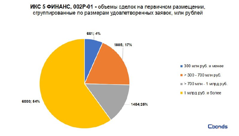 Наибольшую долю в структуре размещения (54%) заняла сделка объемом 6 млрд рублей, на втором месте идут сделки объемом от 700 млн до 1 млрд рублей (25%).