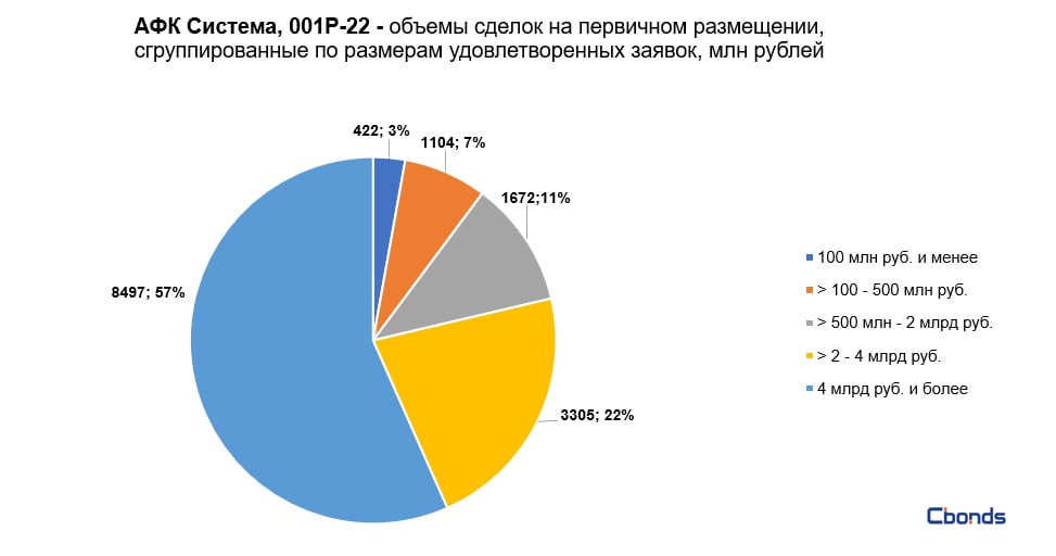 Наибольшую долю в структуре размещения (57%) заняли сделки объемом 4 млрд рублей и более, на втором месте идут сделки объемом от 2 до 4 млрд рублей (22%).