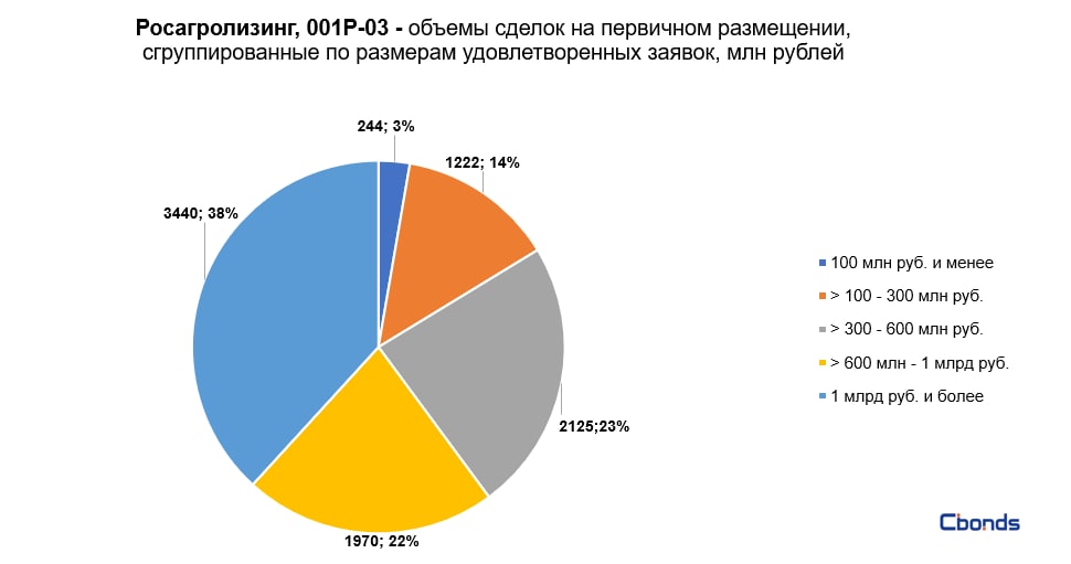 Наибольшую долю в структуре размещения (38%) заняли сделки объемом 1 млрд рублей и более, на втором месте идут сделки объемом от 300 до 600 млн рублей (23%).