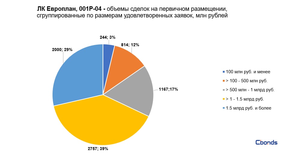 Наибольшую долю в структуре размещения (39%) заняли сделки объемом от 1 до 1.5 млрд рублей, на втором месте идёт сделка объемом 2 млрд рублей (29%).
