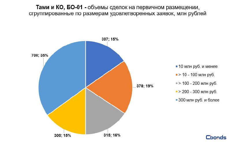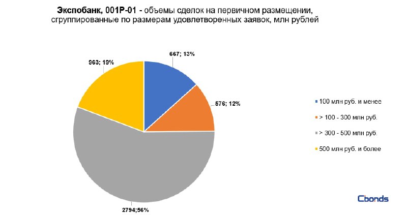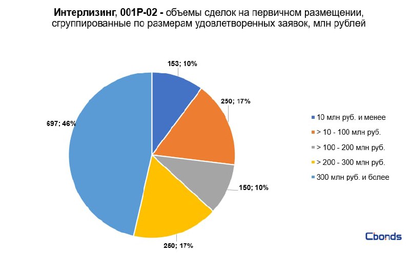 Наибольшую долю в структуре размещения (56%) заняли сделки объемом от 300 до 500 млн рублей, на втором месте идёт сделка объемом 963 млн рублей (19%).