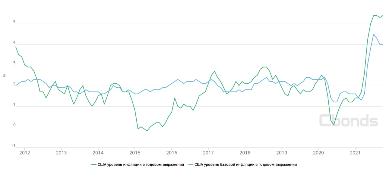 По данным Минтруда США в сентябре инфляция в США выросла до 5.4% за год, превысив консенсус и уровни августа – 5.3%. Значения в 5.4% наблюдались в июне и июле 2021 года, а также 13 лет назад.