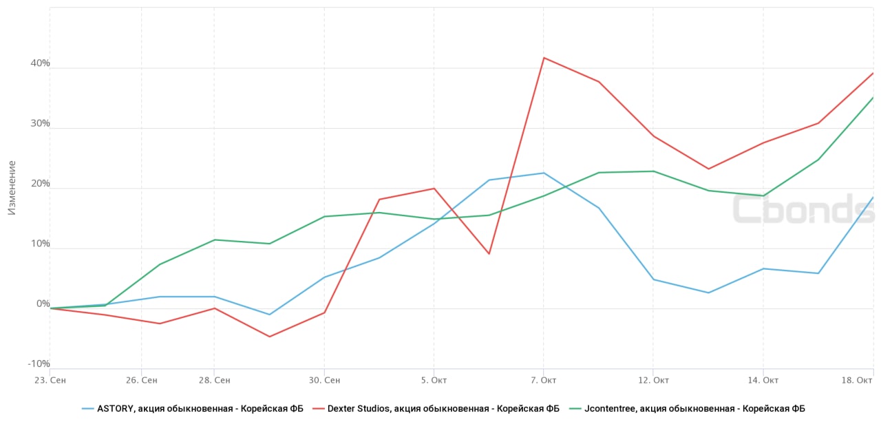 📈Акции корейской студии «Santa Claus Entertainment» на торгах в понедельник взлетели примерно на 30%. Акции южнокорейской медиа-компании «Astory», создавшей сериал о зомби «Королевство», вчера выросли на 12% (45 800 южнокорейских вон (KRW) против 40 900 KRW по итогам торгов пятницы). Бумаги студий «Dexter Studios Co Ltd» выросли на 10%, «Jcontentree Corp» – более чем на 6%.
