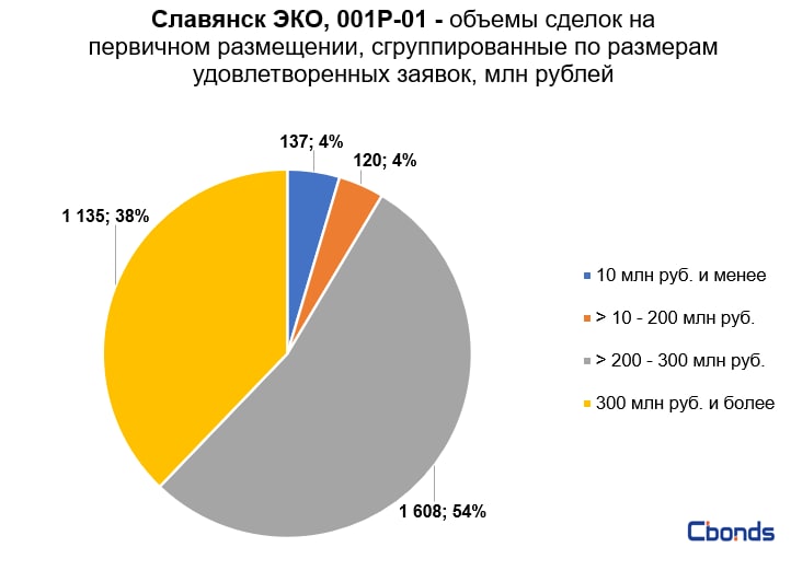 Наибольшую долю в структуре размещения (54%) заняли сделки объемом от 200 до 300 млн рублей, на втором месте идёт сделка объемом 1.135 млрд рублей (38%).